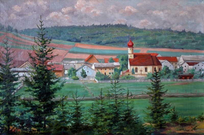 Meilenhofen um 1950, Blick vom Waldrand jenseits des Schuttertals im Süden, Öl auf Leinwand von Oswald BÖHME, Nassenfels, (ca. 60 x 40 cm², sign.: Os. Böhme-Tauber), restauriert 2011 von Sophie Richter. Im Eigentum der Privatsammlung G. Vogelsang, Heilbronn