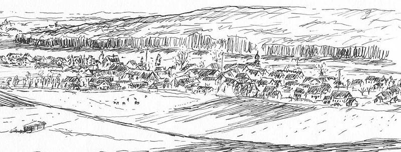 Meilenhofen 2001, Blick von der Biesenharder Höhe im Nordwesten, Tuschfederzeichnung von Siegfried SCHIEWECK-MAUK, Eichstätt.