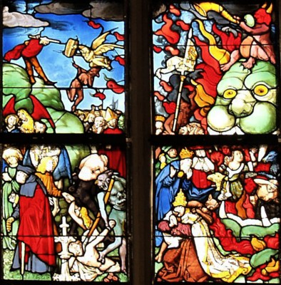 "Weltgericht", Detail des Fensters im Mortuarium des Doms zu Eichstätt nach einem Entwurf von Hans HOLBEIN d. Ä. (1465 - 1524), entstanden um 1500 - 1505 in Augsburg . Rechts unten: Kaiser und Papst auf dem Weg zur Hölle.